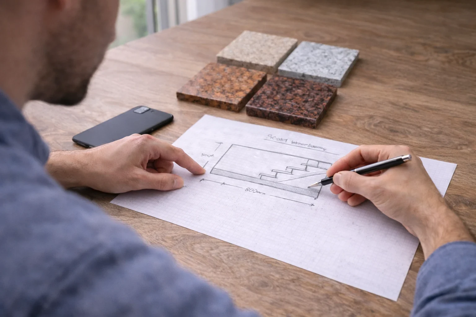 Nie wykonujemy konstrukcji schodów. Sprzedajemy elementy schodowe z kamienia — takich jak stopnie, podstopnice, cokoliki, spoczniki i inne detale wykończeniowe, przygotowane na wymiar do istniejącej lub projektowanej konstrukcji.